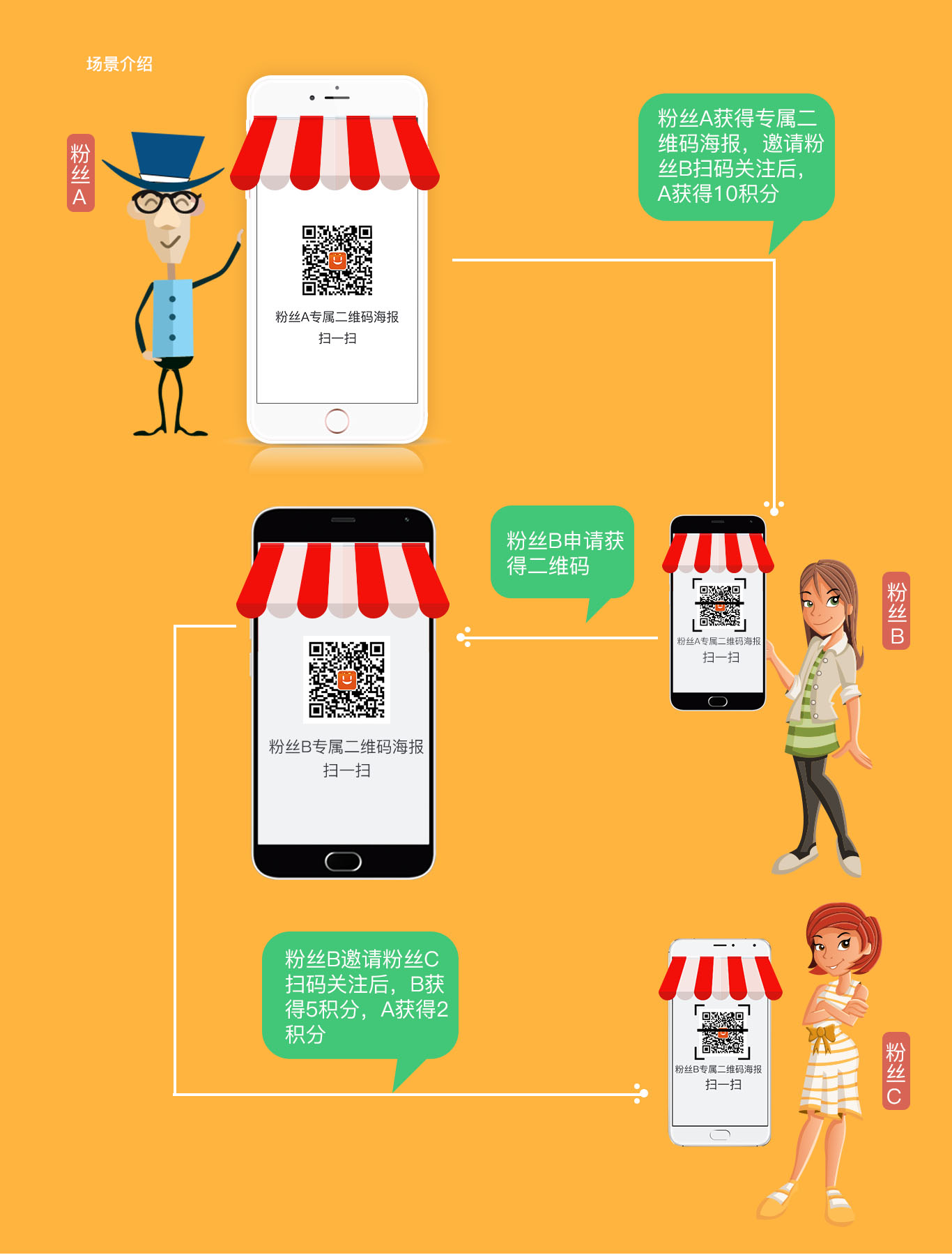 粉丝A获得专属二维码海报,邀请粉丝B扫码关注后,A获得10积分;粉丝B如果申请获得二维码,邀请粉丝C扫码关注后,B获得5积分,A获得2积分。